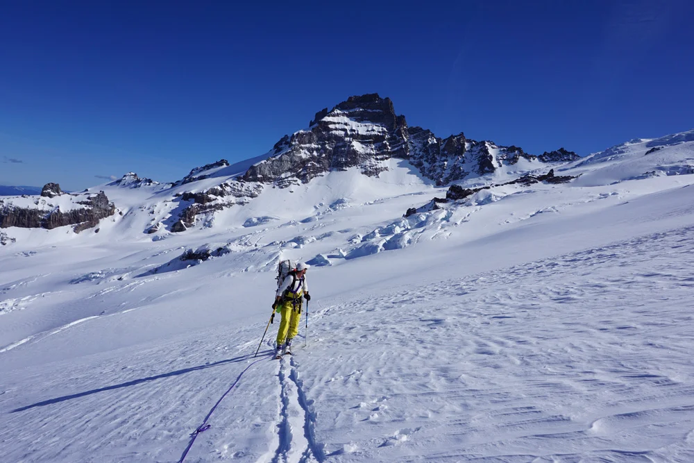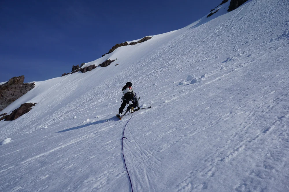 We break camp at first light and ski up a dire 2000’ slope that chokes into a narrow ice chute at Puyallup Pass. While Chris is using ski crampons that bite the ice under his bases, I resort to weighting my ski’s metal edges for traction. I jam my pole under my downhill ski to keep my edge from slipping out.