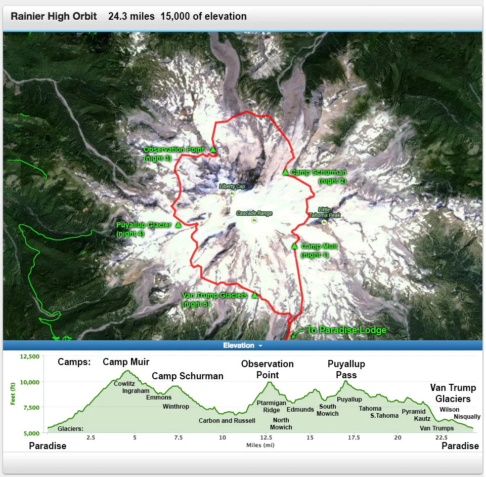 “High Orbit” is a rarely climbed/traversed route on Mount Rainier. It takes a 360-degree line around the massive volcano, yo-yoing between 7,000 and 10,000 feet via climbing routes and glacier traverses. It’s a 20+ mile trip, and for much of it climbers are on skis and roped, often with an ice axe in hand. Along its course the High Orbit tags pieces of the routes that helped define American alpinism: Liberty Ridge, Curtis Ridge, Ptarmigan Ridge, Edmunds Headwall, Willis Wall, and more.