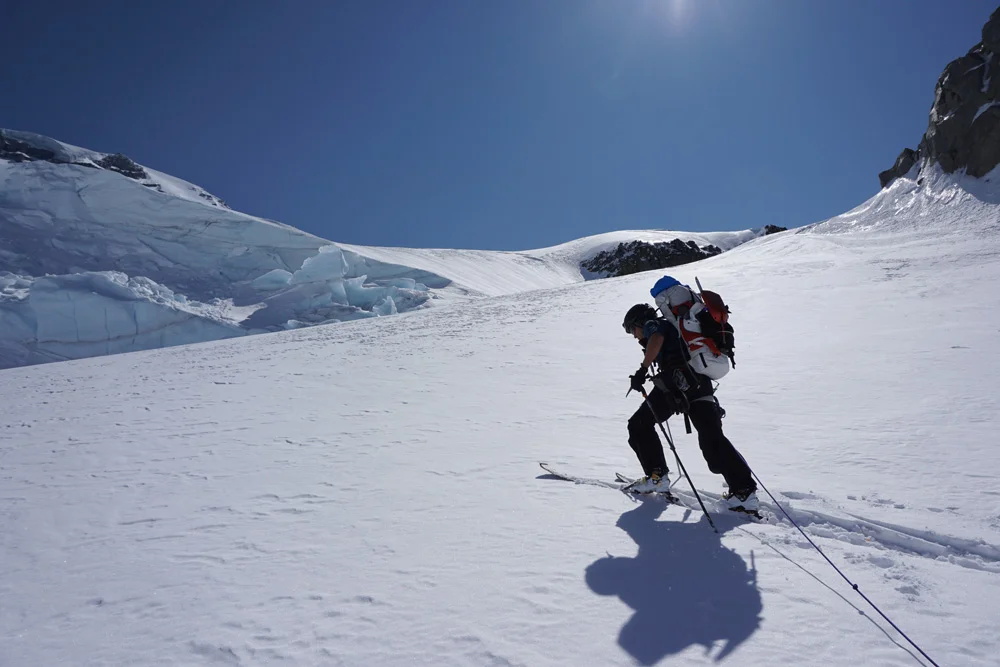 After traversing a knife-blade ridge, we unclip from the rope, strap skis to the packs, and feel our nerves tighten as we each pick our own line down the relentless grade. Like two flecks of pepper on a table of salt, I feel insignificant and exposed on the massive slope. Two hours later we finally roll out into the basin and scamper to a safe place where we can strap back into the comfort of our skis.