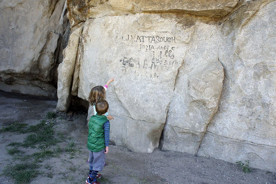 “Back in the day”, Almo Valley and the City of Rocks served as a waypoint for westbound emigrants pursuing manifest destiny. It’s said that over 250,000 people rolled through the area between 1840’s-1870’s along the California Trail. They often marked their passage in axle grease, writing their names on the rock walls. Fifty or so names still stain the walls, which you can see on Register and Camp rocks.